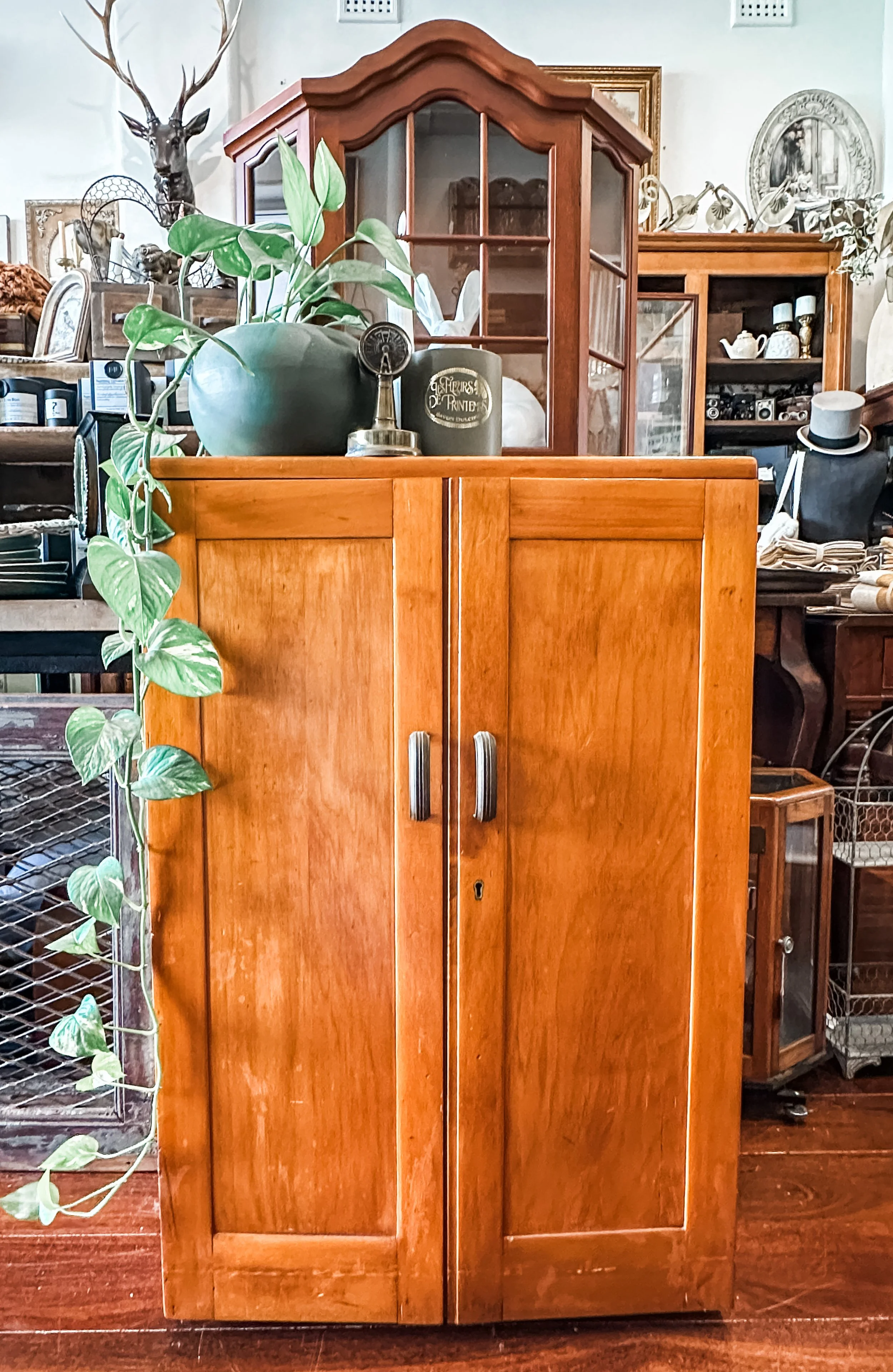 Crafted from solid timber with a warm honey-toned finish, this beautifully preserved mid-century filing cabinet offers both form and function. Behind its clean-lined paneled doors are a series of graduated pigeonhole compartments, ideal for organising documents, art supplies, or even vinyl records. The brushed metal handles add a subtle industrial touch, complementing its practical design. Whether used in a home office, creative studio, or as part of a retail display, this piece brings timeless craftsmanship into any space.